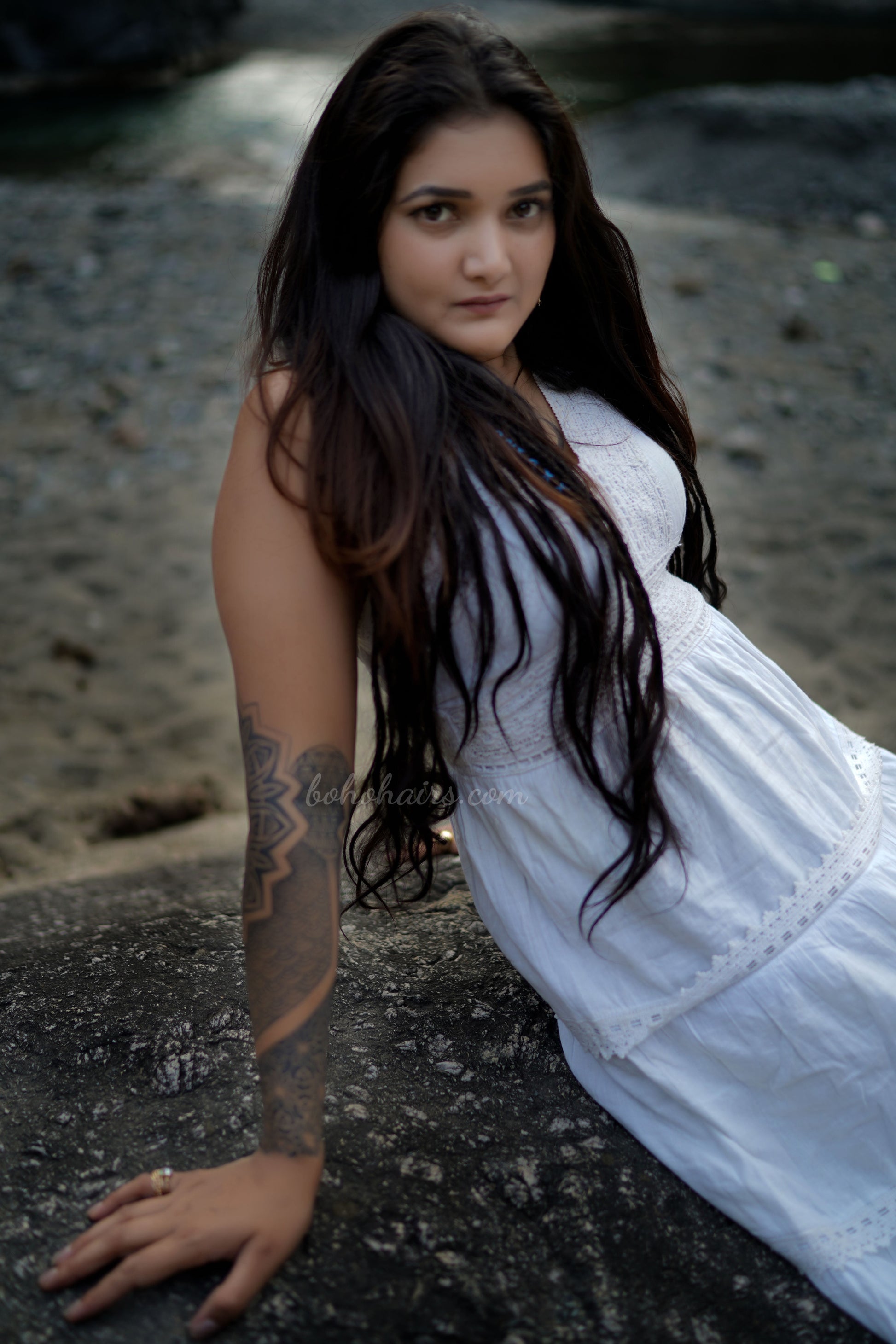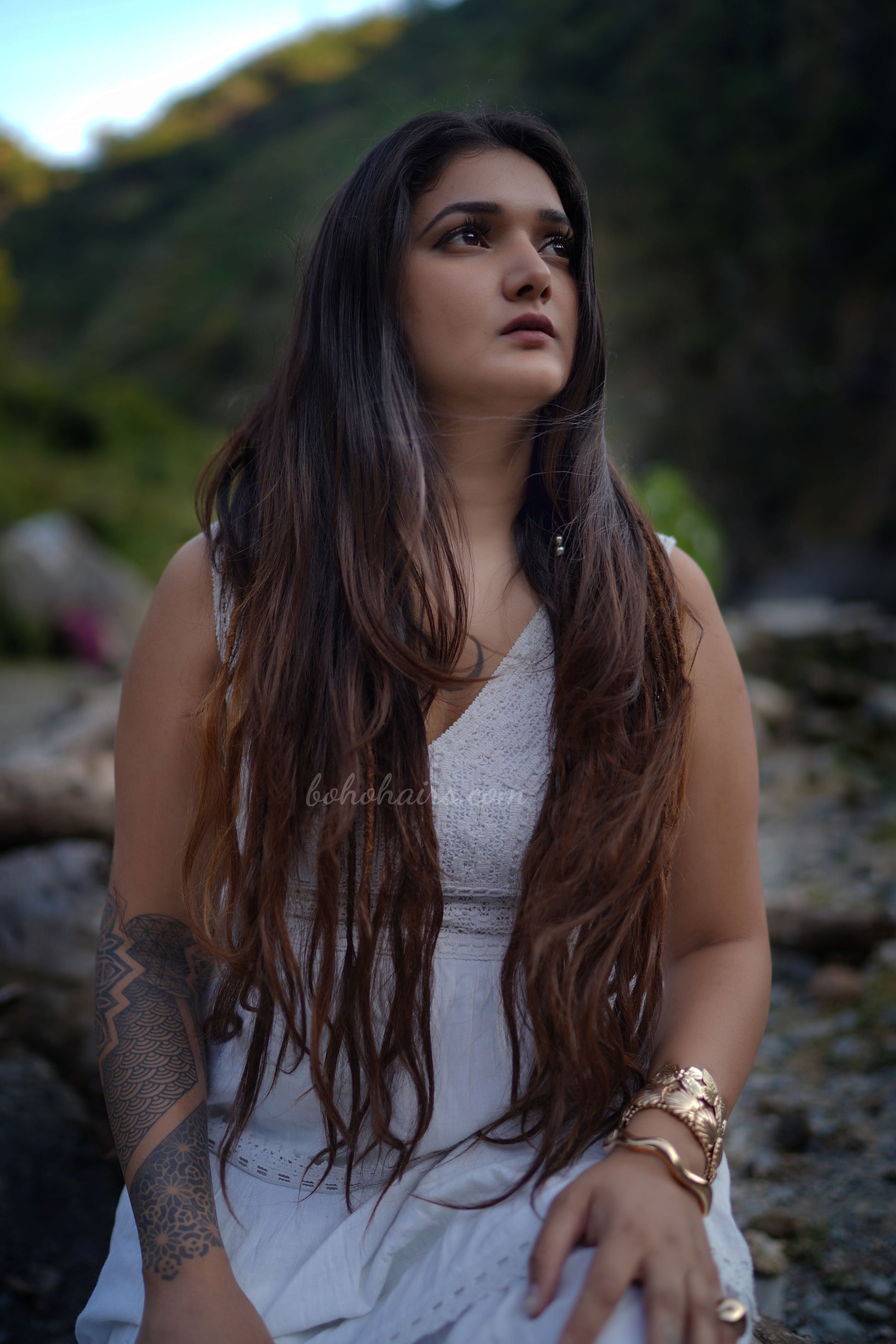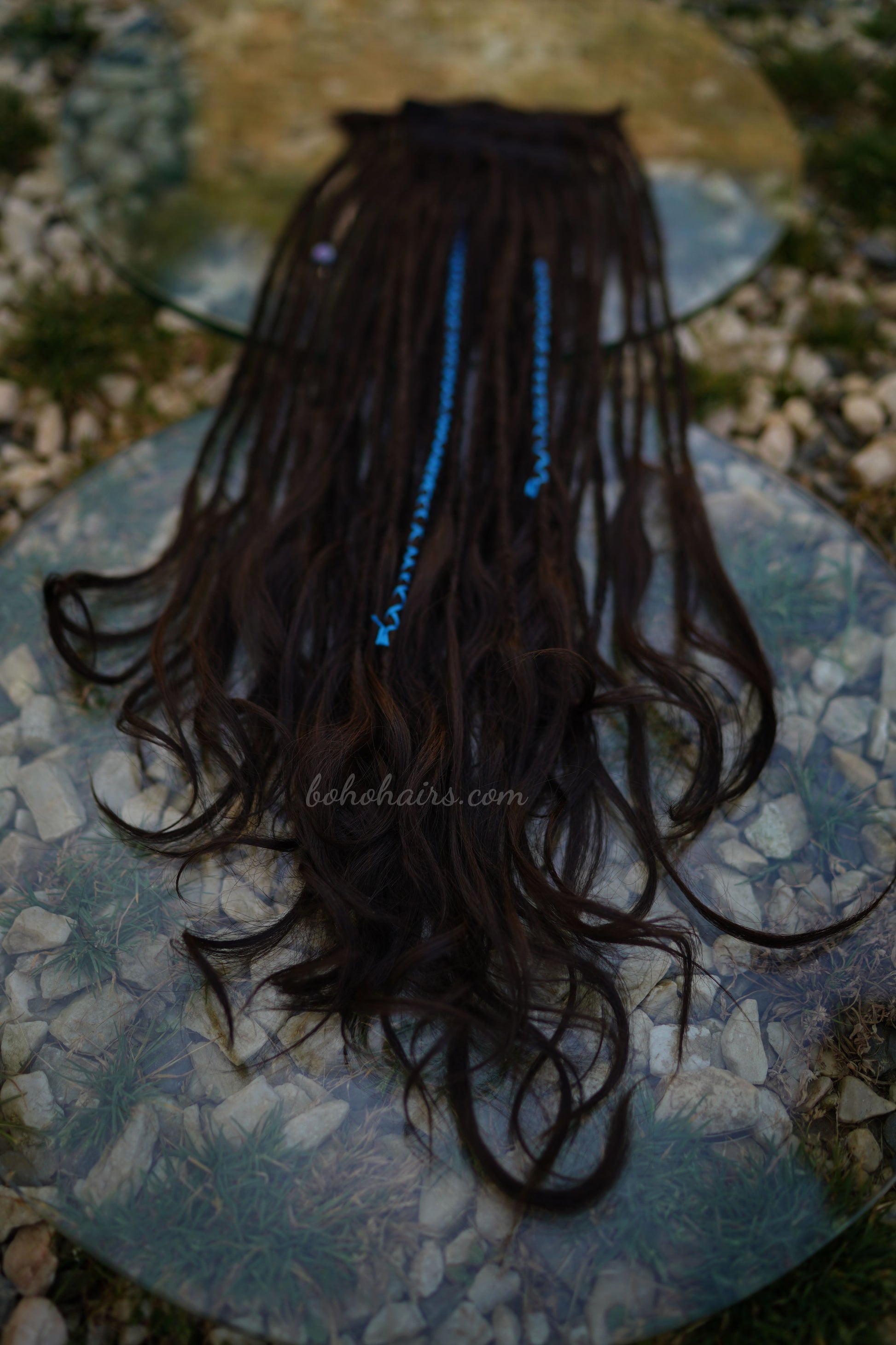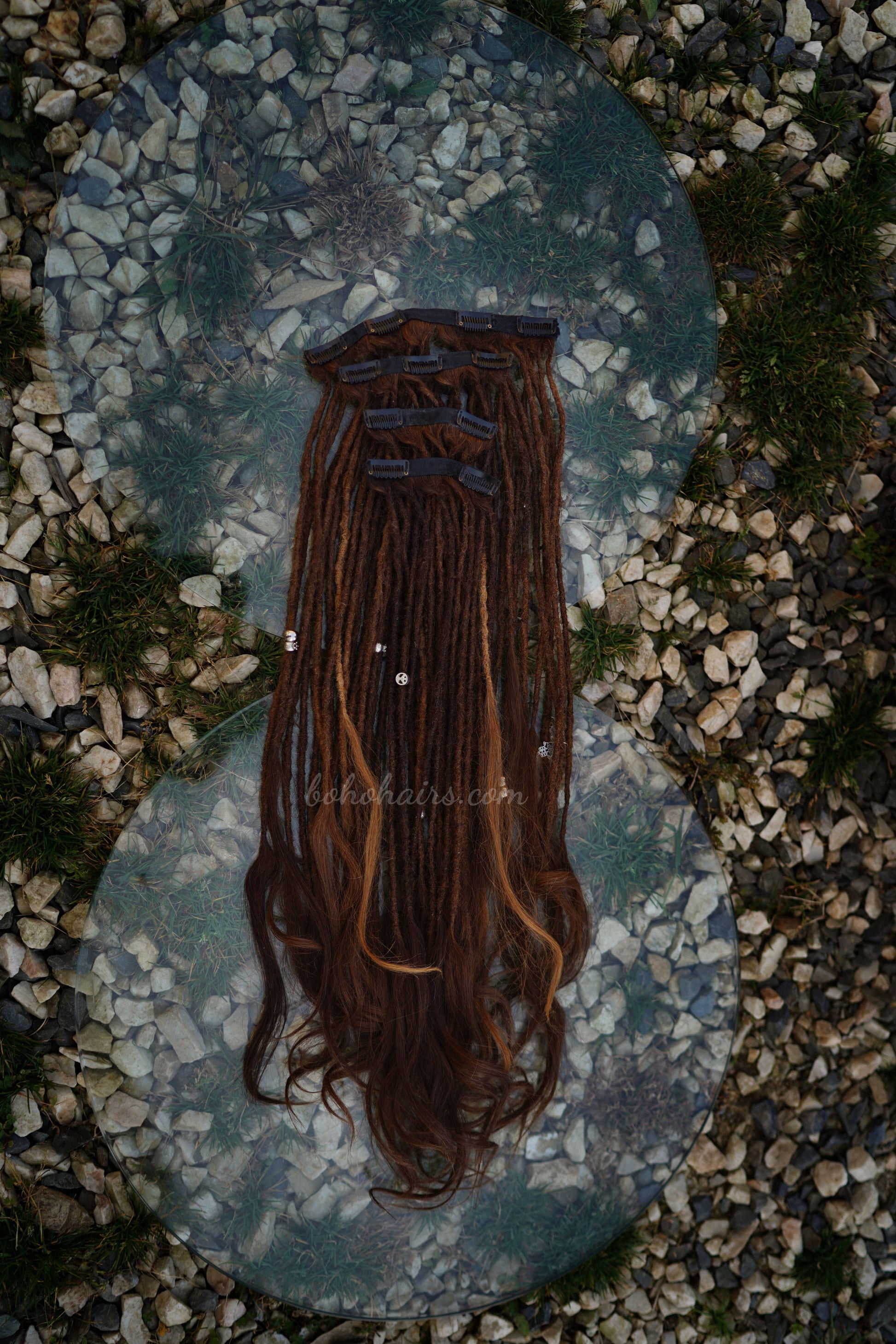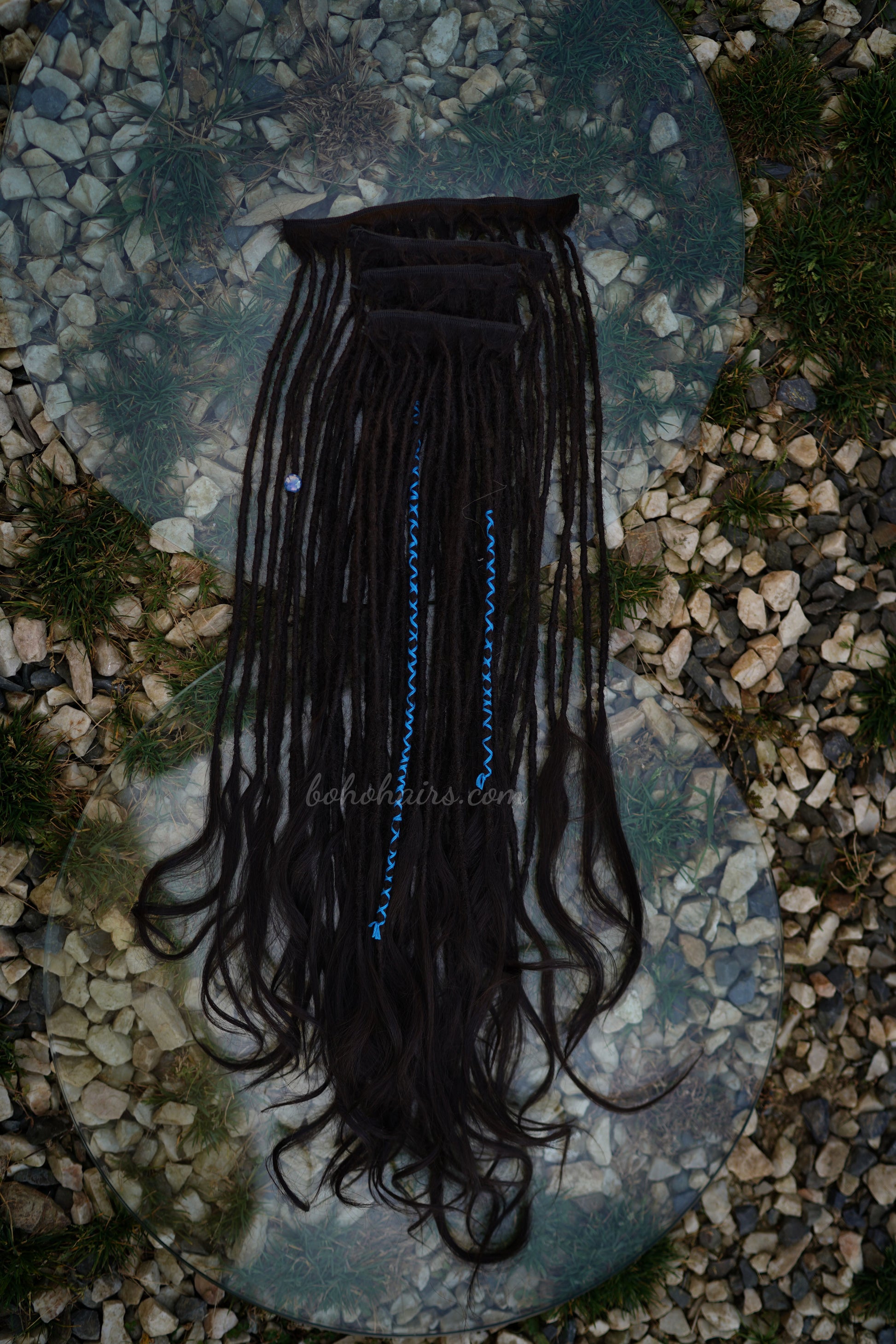 53 dreadlocks stitched on lace with clips, in 4 patches for perfect blend for Back Head Coverage. Decorated with Charms. Length Options: 22 inches, 30 inches, 35 inches Type: Micro thickness dreadlock extensions in 4 clip-on patch set with open hair tips Material: 100% human hair